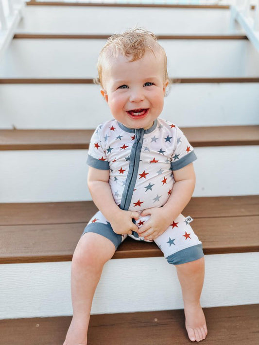 RED WHITE & BLUE STARS | SHORTIE ZIP ROMPER
