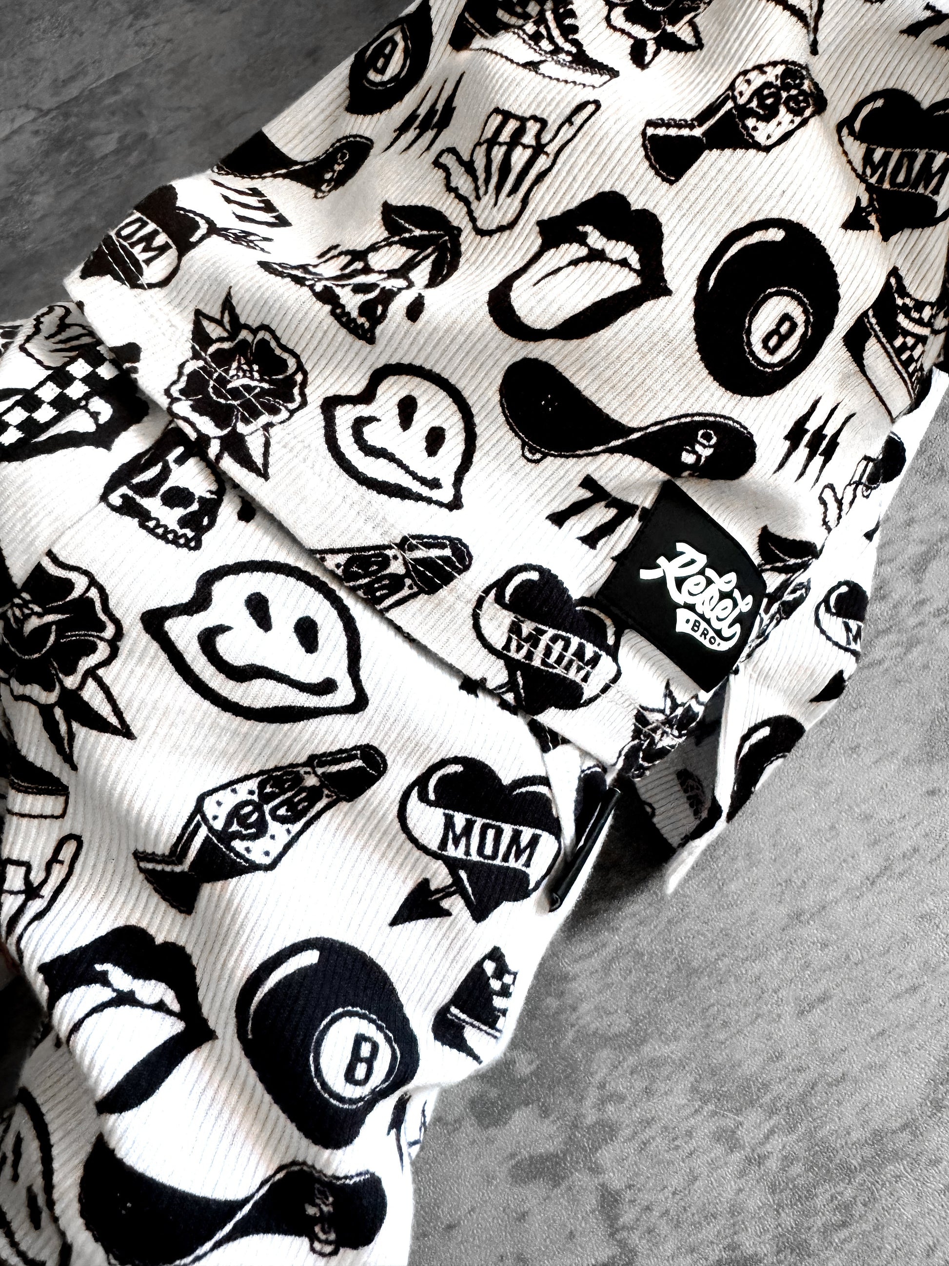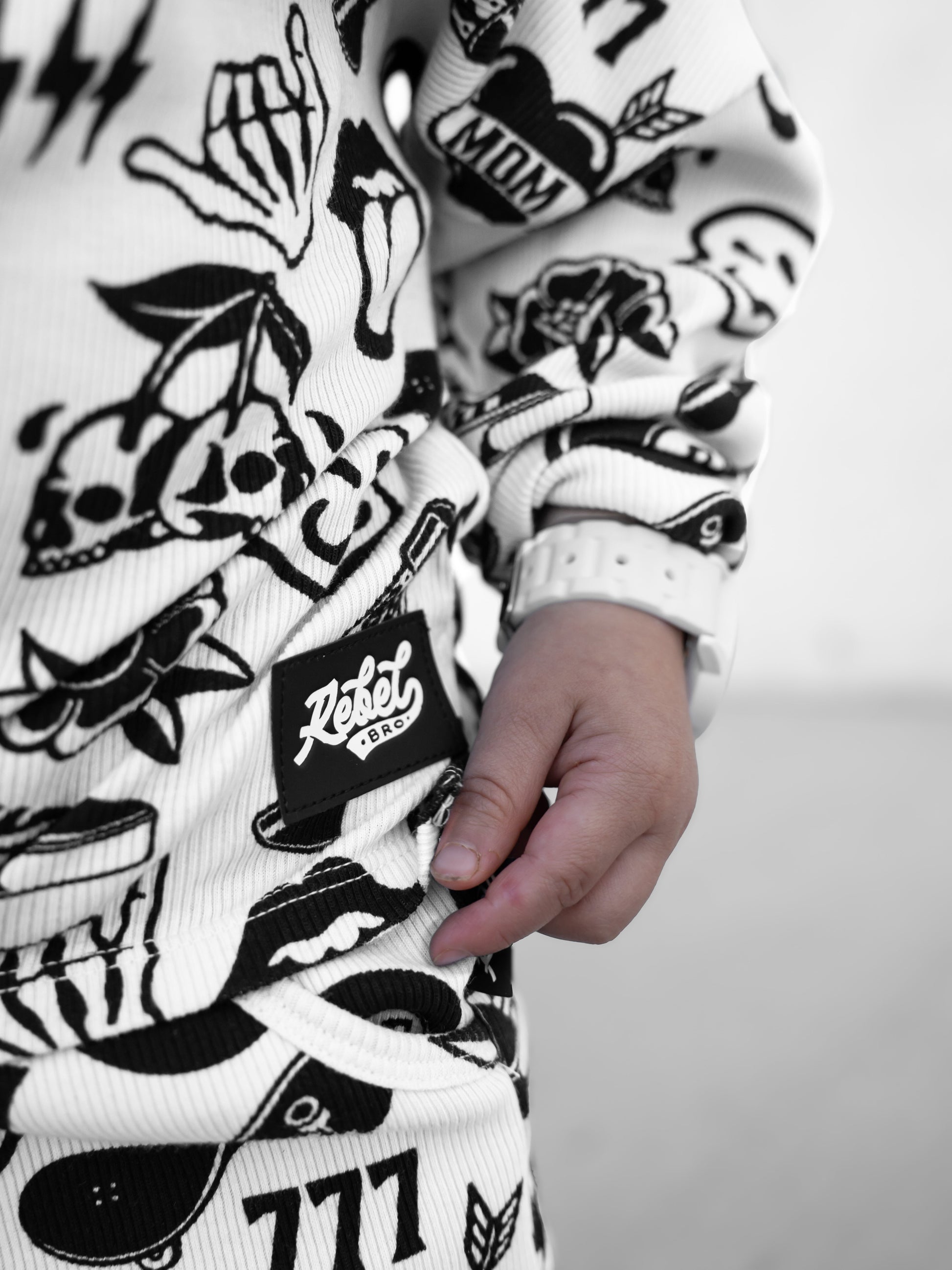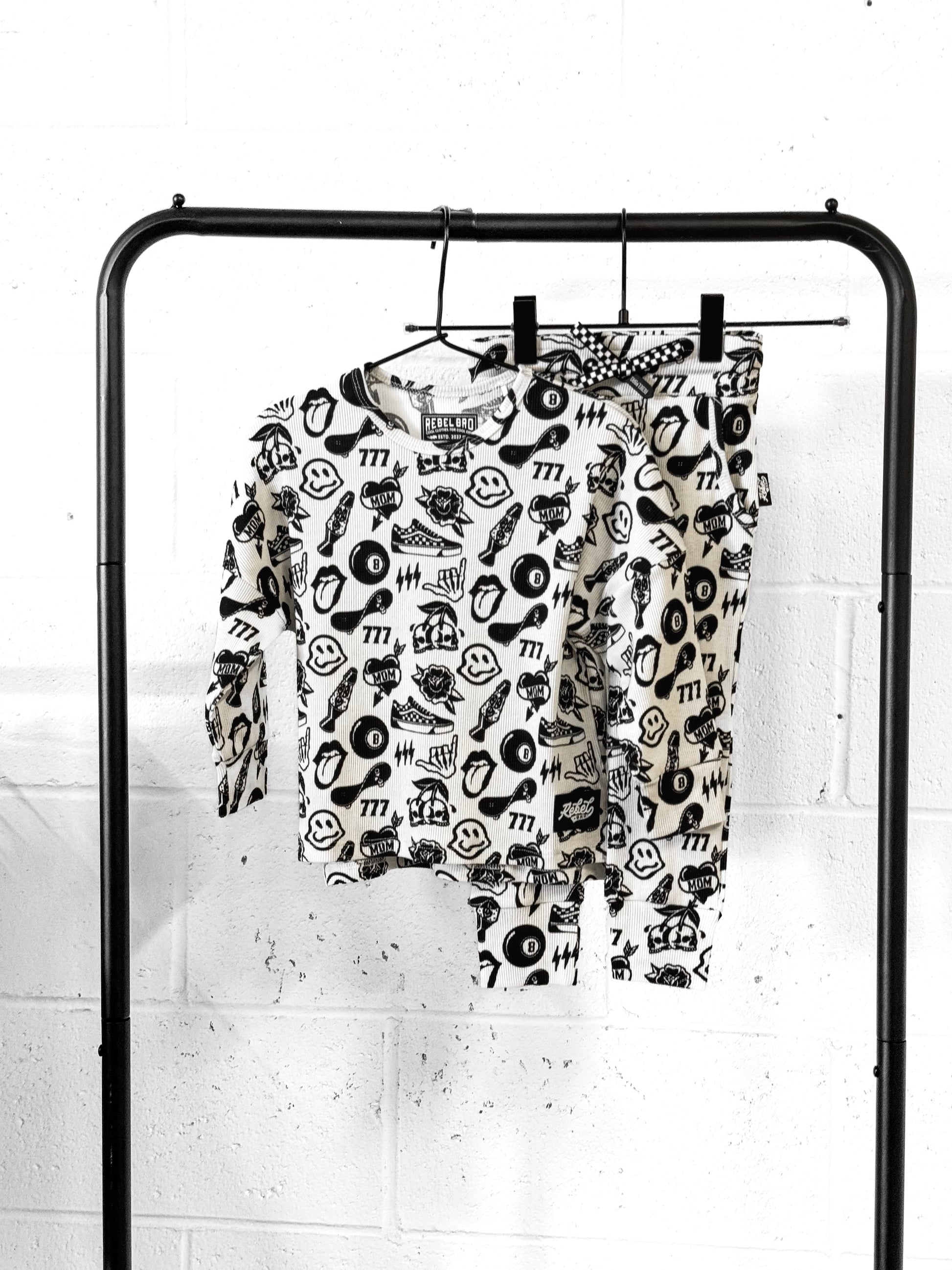 Our bestselling organic ribbed sets come with a long sleeve swoop rear top + jogger-style bottoms featuring : an elastic waist band, secured and adjustable drawstring and front pockets. Our organic cotton + spandex fabric is preshrunk to allow for the most true to size fit possible — even after laundering.
