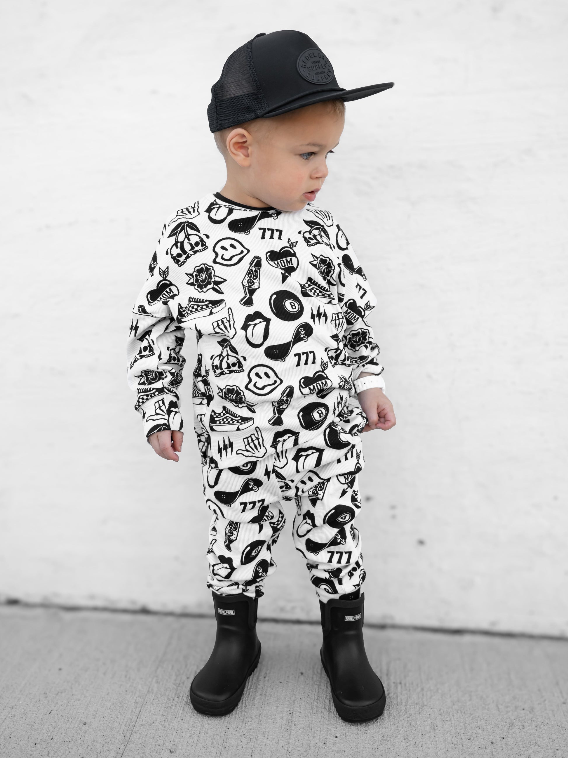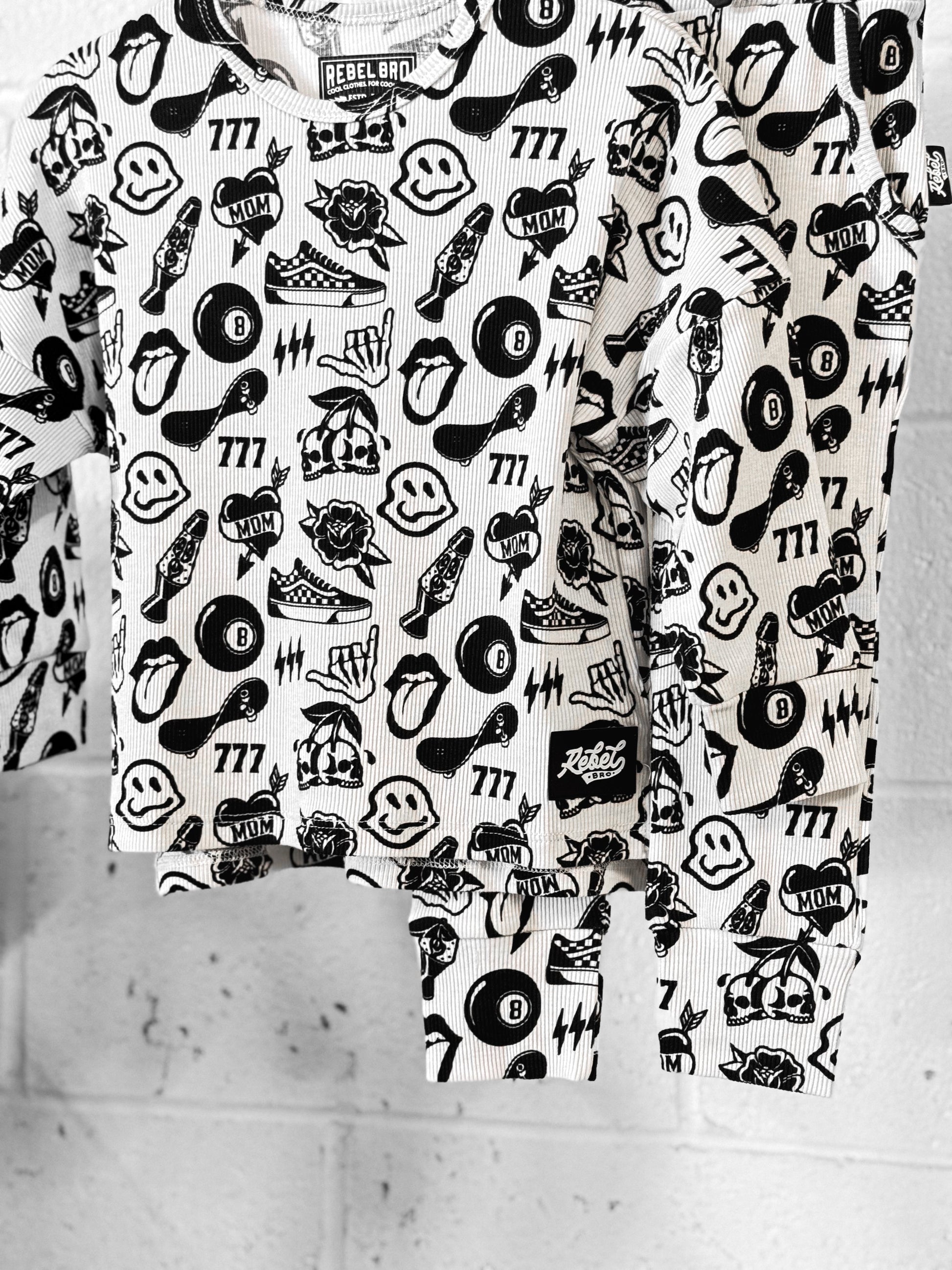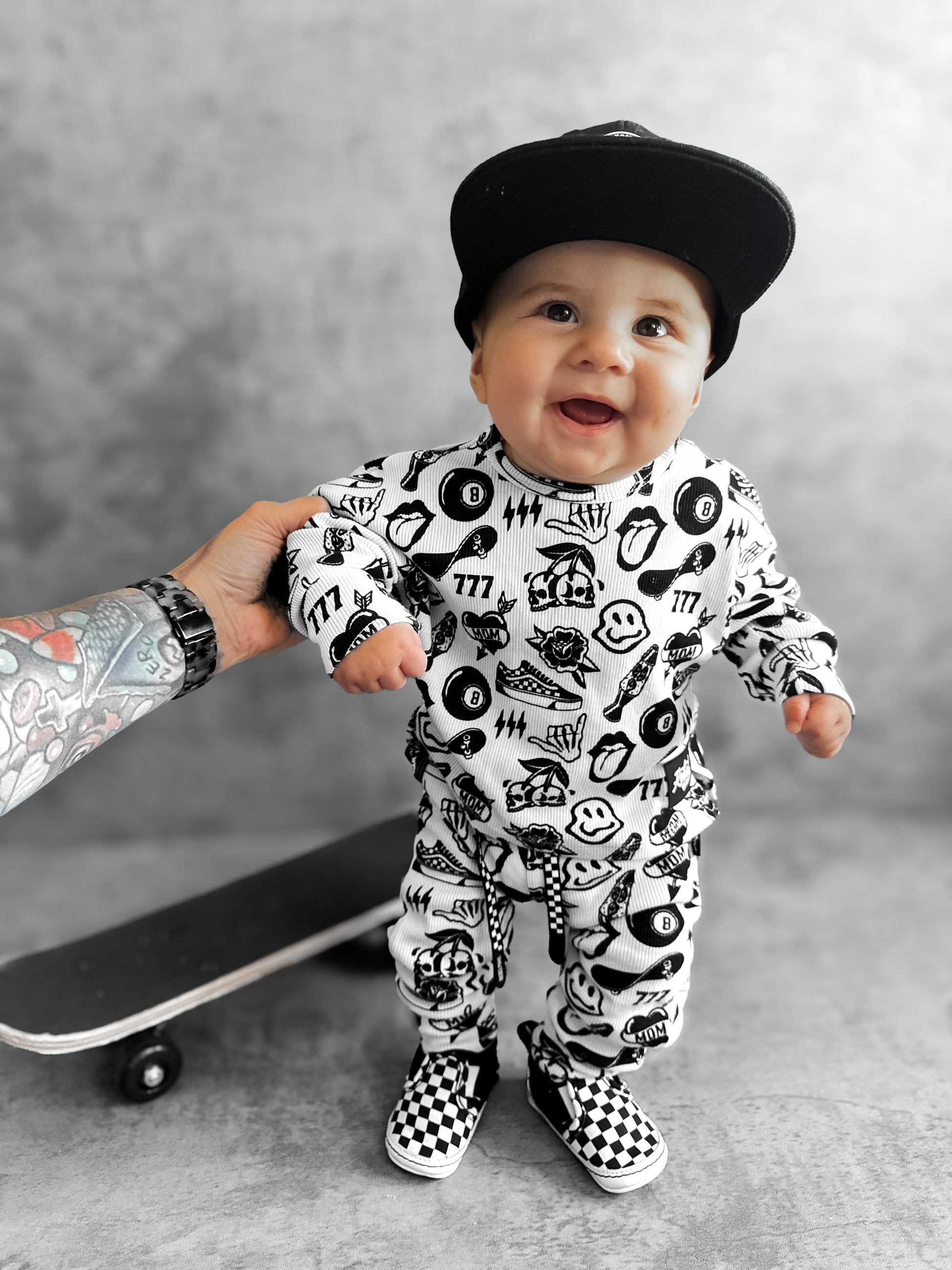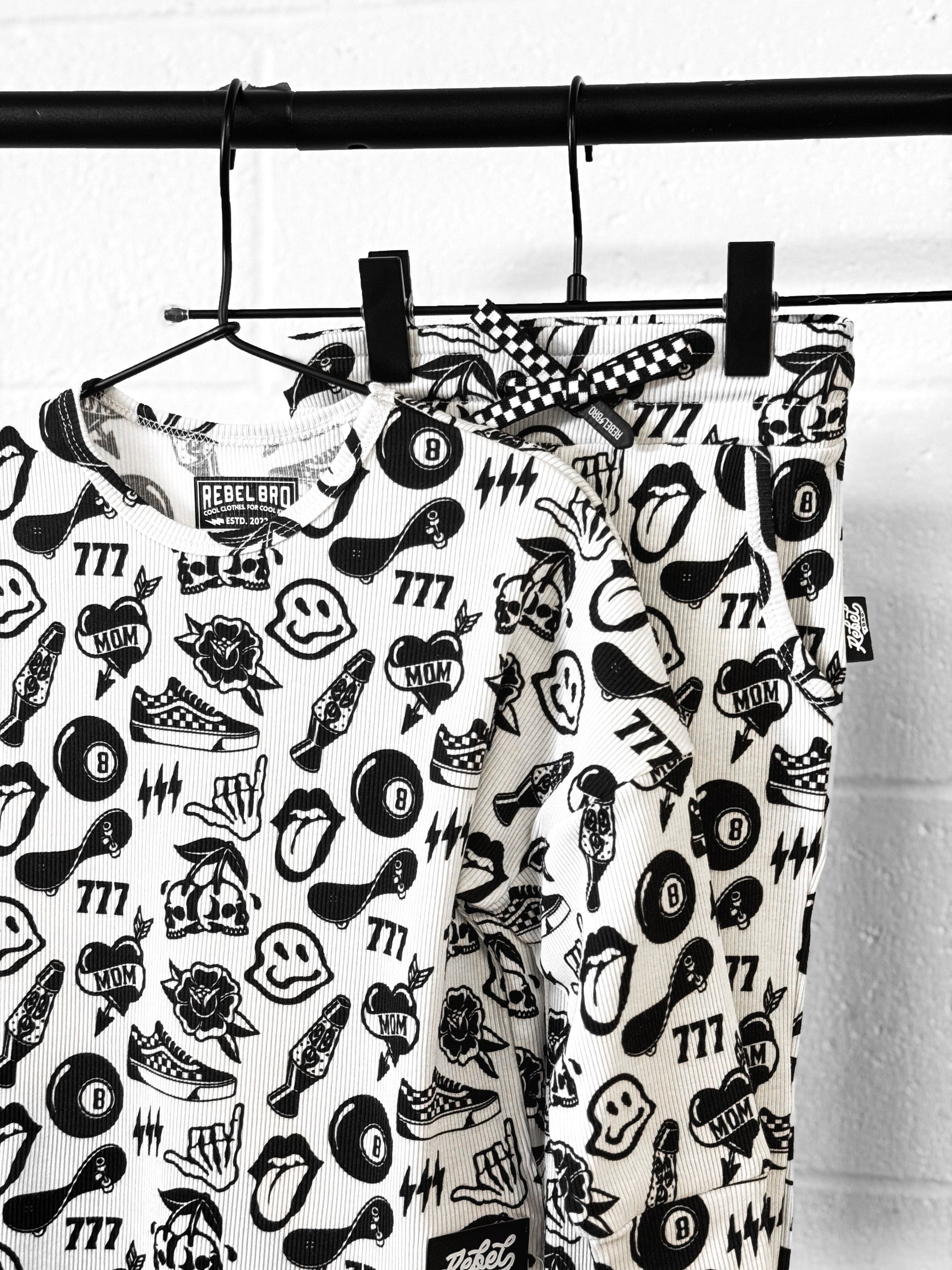 Our bestselling organic ribbed sets come with a long sleeve swoop rear top + jogger-style bottoms featuring : an elastic waist band, secured and adjustable drawstring and front pockets. Our organic cotton + spandex fabric is preshrunk to allow for the most true to size fit possible — even after laundering.