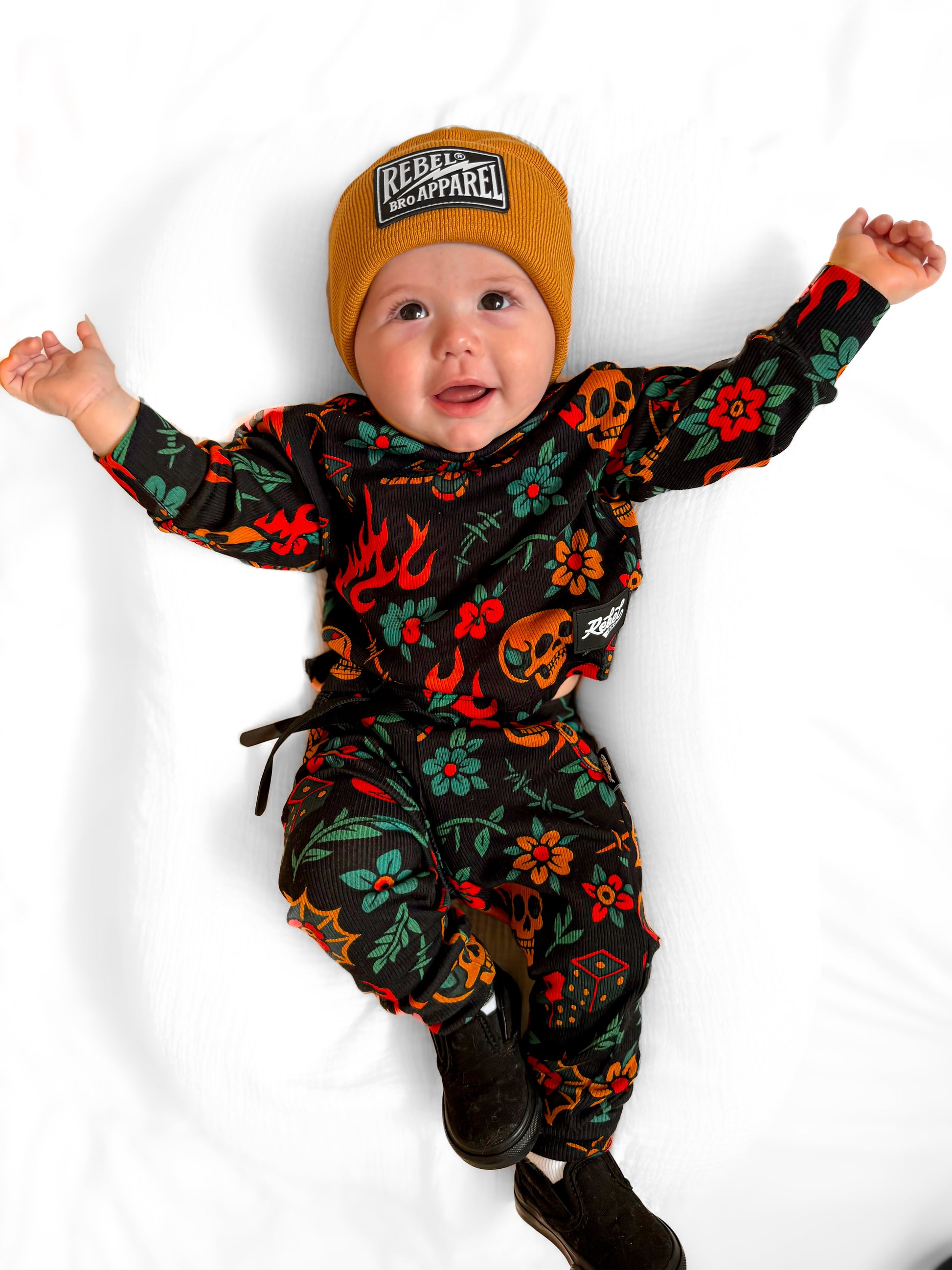Our bestselling organic ribbed sets come with a long sleeve swoop rear top + jogger-style bottoms featuring : an elastic waist band, secured and adjustable drawstring and front pockets. Our organic cotton + spandex fabric is preshrunk to allow for the most true to size fit possible — even after laundering.