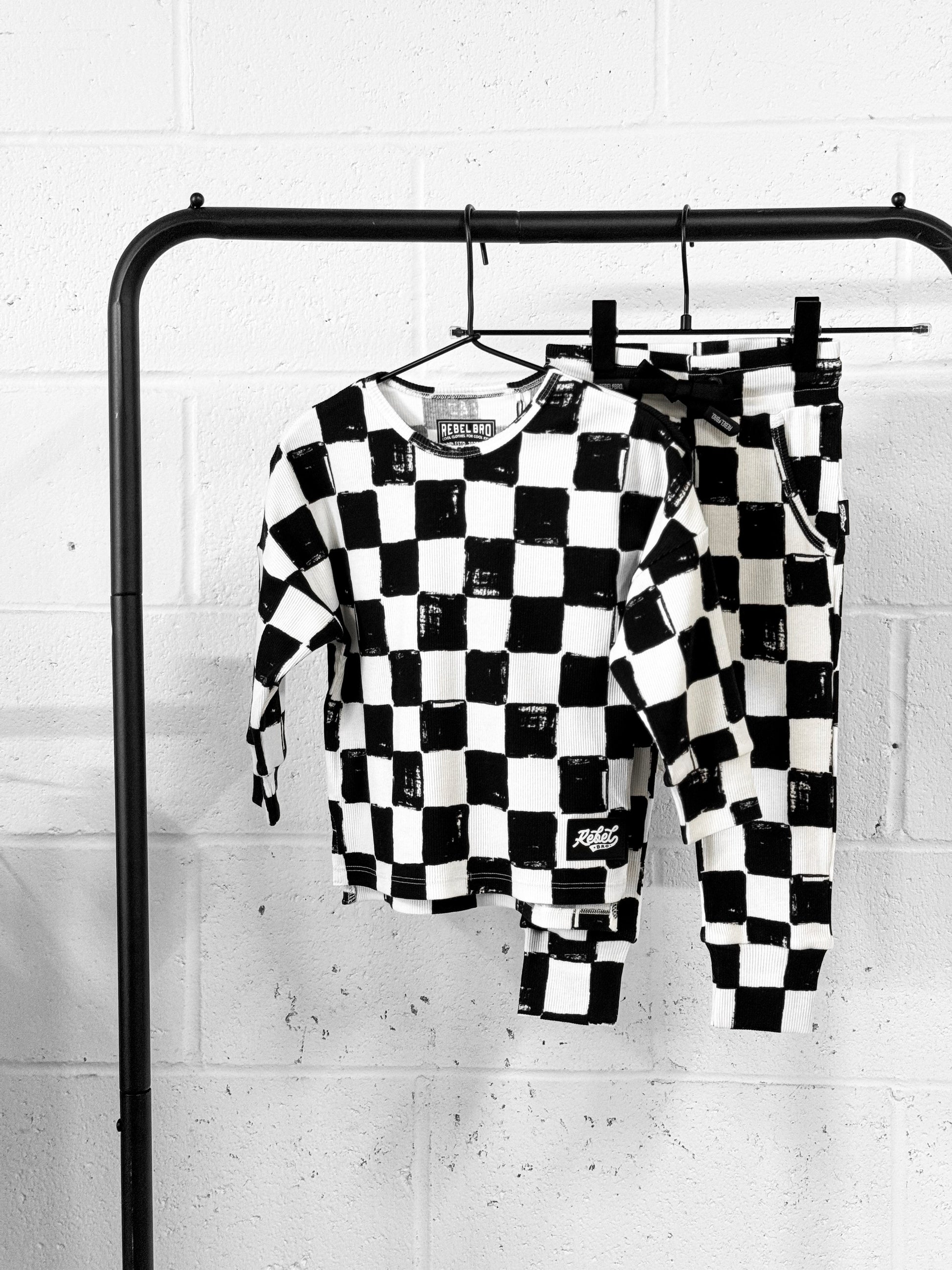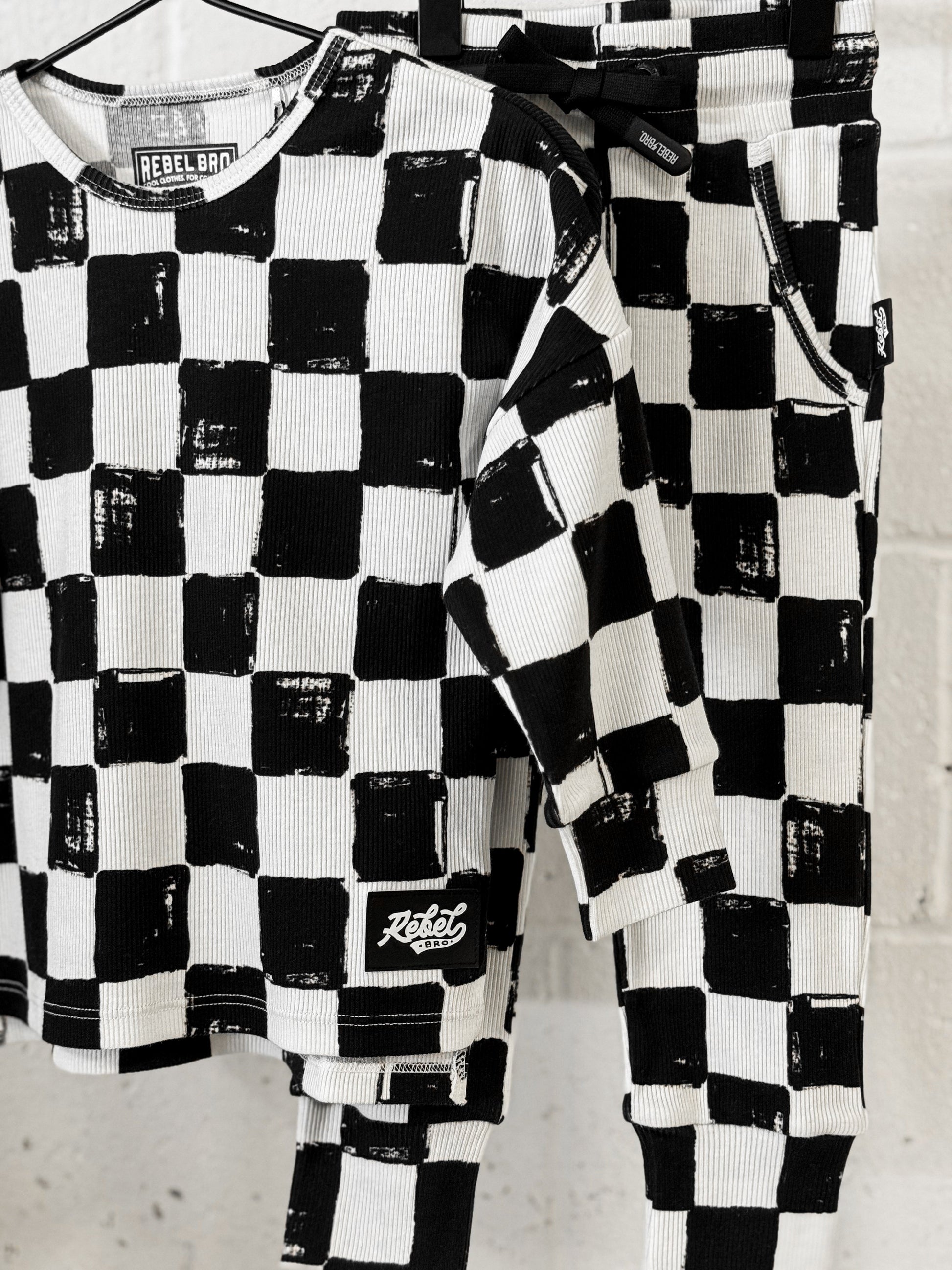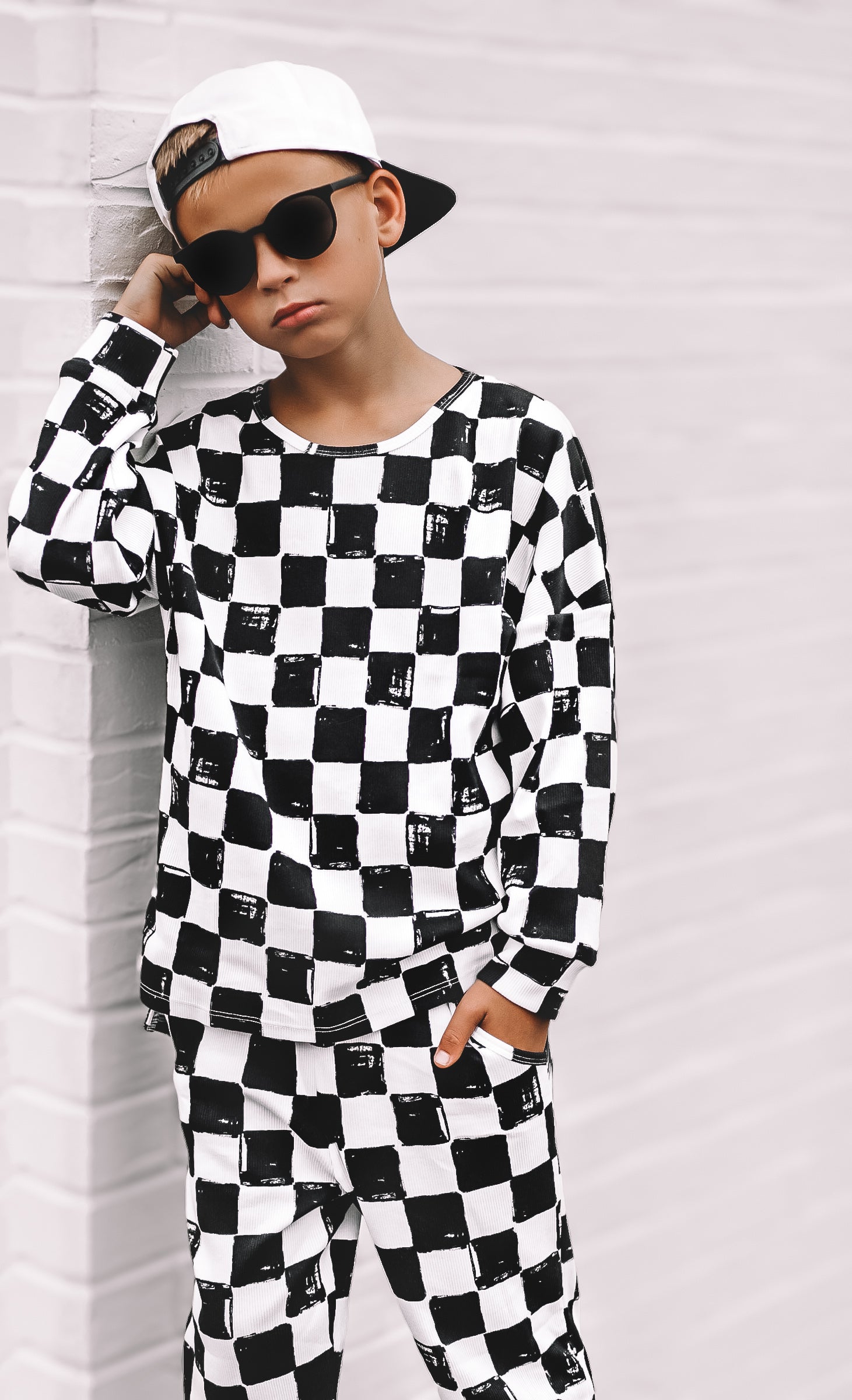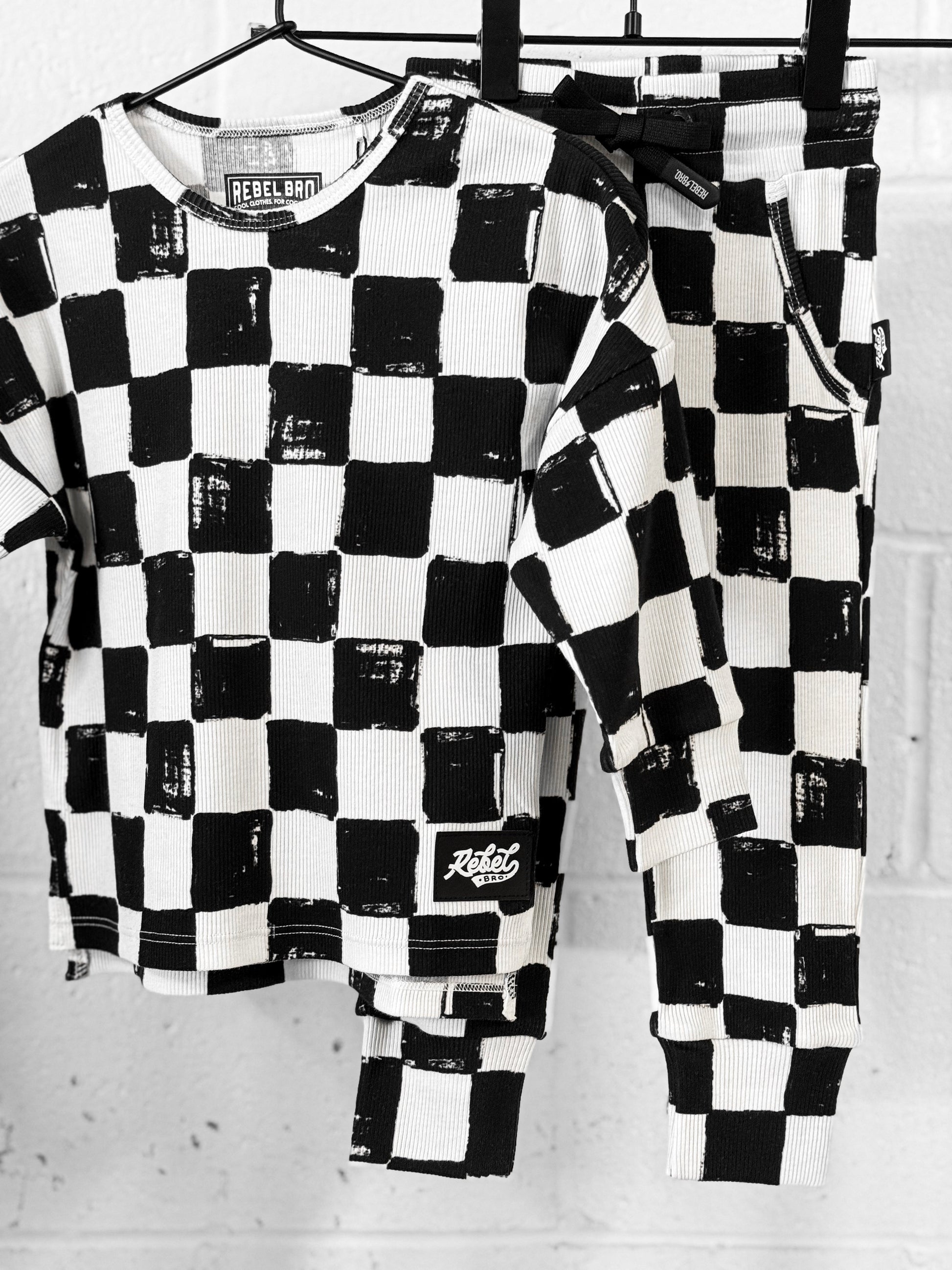 Our bestselling organic ribbed sets come with a long sleeve swoop rear top + jogger-style bottoms featuring : an elastic waist band, secured and adjustable drawstring and front pockets. Our organic cotton + spandex fabric is preshrunk to allow for the most true to size fit possible — even after laundering.
